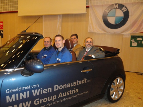 BMW Wien und BMW Austria spendeten der Siegfried-Marcus-Berufsschule ein Mini Cabrio, damit die Lehrlinge in den nächsten Jahren daran „üben“ können.