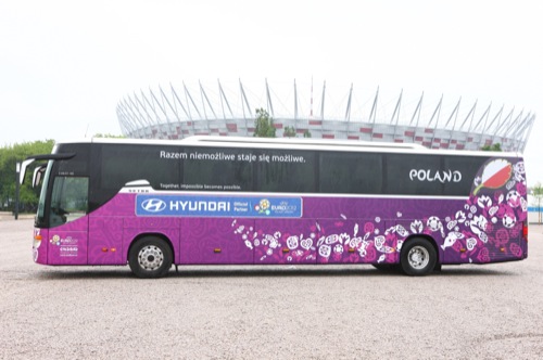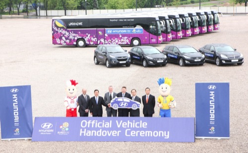 Der koreanische Autohersteller, der mittlerweile längst auch in Europa produziert, ist seit einigen Jahren Sponsor von Welt- und Europameisterschaften. So auch diesmal, wo die Pkws und Busse vor dem polnischen Nationalstadion in Warschau vom Hersteller an die UEFA übergeben wurden. Ein Großteil der Fahrzeuge sind Hyundai H-1 (Transporter), ix55, ix35, i40 und i30, die für den Transport von UEFA-Mitarbeitern, Spielern und Gästen verwendet werden. Daneben wurden für die Fußball-Teams jedes teilnehmenden Landes speziell beklebte Busse bereitgestellt. Die Fußball-EM in Polen und der Ukraine beginnt am 7.6.