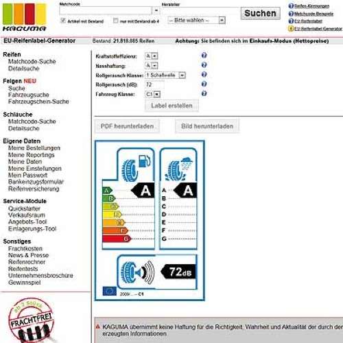 Auf der Internetseite www.kaguma.at wurde rechtzeitig vor dem Inkrafttreten der EU-Reifenverordnung ein eigener „Reiter“ zum Thema „EU-Reifenlabel“ implementiert. Dort erhalten die Kunden die Daten zu den drei Bereichen Kraftstoffeffizienz, Nasshaftung und externes Abrollgeräusch auf einen Blick. Laut Marco Schulz, dem Geschäftsführer der Reifenhandels-Plattform, zeige man dem Kunden neben den Reifenlabeldaten auch die dazu gehörigen Testergebnisse auf einen Blick. So könne man den Kunden deutlich mehr Informationen liefern, beispielsweise über das Bremsen auf Schnee.