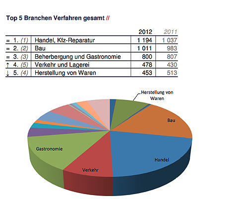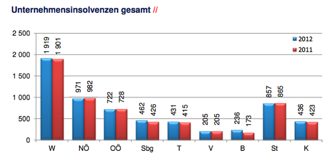 Insgesamt werden lt. AKV in Österreich heuer 6.239 (plus 1,98 %) Unternehmen Pleite gehen (2011: 6.118). Im Jahr 2012 stieg die Zahl eröffneten Unternehmensinsolvenzen von 3.268 auf 3.479 Verfahren und somit um 6,46 %. Die Insolvenzabweisungen mangels Masse konnten um 3,16 % von 2.850 (2011) auf 2.760 reduziert werden.