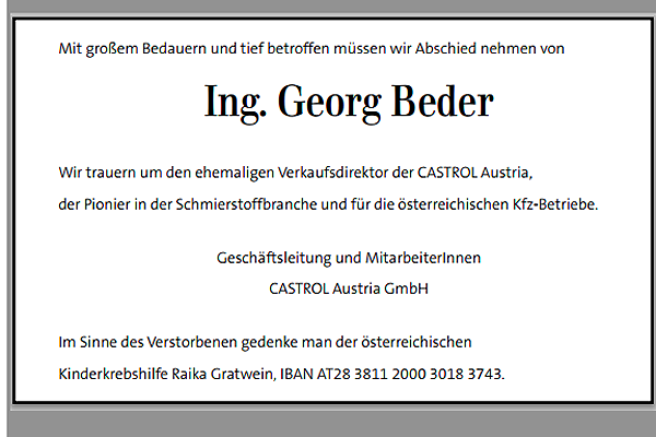 Ing. Georg Beder, langjähriger Verkaufs- und Marketingdirektor von Castrol Austria, ist im 72. Lebensjahr nach schwerer Krankheit verstorben.