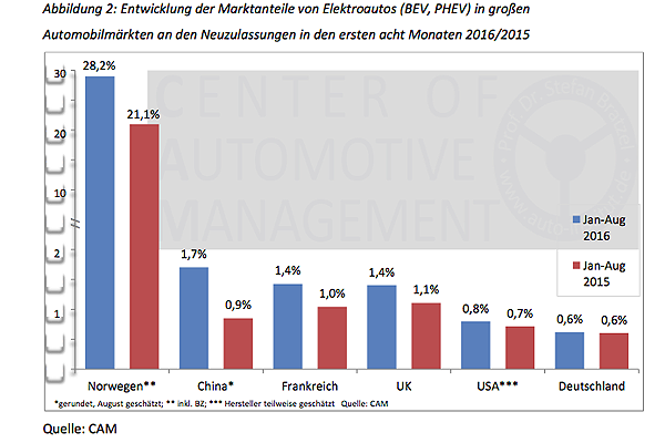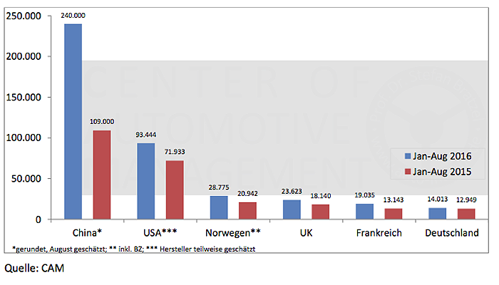 Das globale Wachstum der Elektromobilität wird weiterhin vor allem vom chinesischen Markt getrieben, während das Wachstum in anderen Märkten nur langsam voranschreitet, wie eine eine aktuelle Analyse des Center of Automotive Management (CAM) zeigt.
