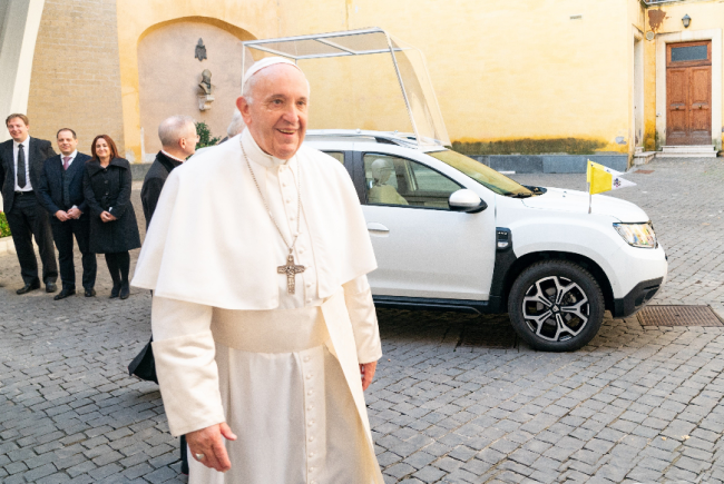Christophe Dridi, Vorstandsvorsitzender Dacia SA und Managing Director Groupe Renault Romania, sowie Xavier Martinet, General Manager Renault Italien, übergaben Papst Franziskus einen spezialangefertigten Dacia Duster mit Allradantrieb.
