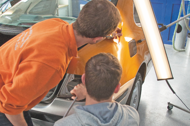 Ein Beispiel für die förderbare Lehrlingsausbildung ist der Kurs "Moderne Karosseriereparatur mittels Drück-u. Klebetechnik für Lehrlinge", der von den beiden Firmen angeboten wird. Dabei lernen die Techniker, wie man diverse Karosserieschäden mittels Drück-und Klebetechnik mit dem Dellenwerkzeug so vorrichtet, dass anschließend die Spachtel-und Füllerarbeit durchgeführt werden kann. Der Kurs findet am 8. und 9. November 2021 in Linz statt.
