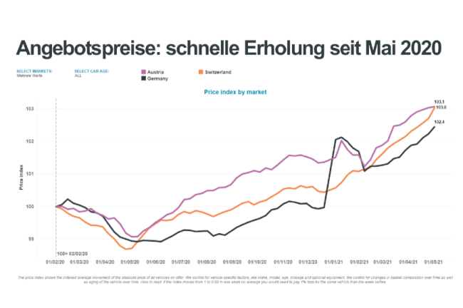 Bei den Restwerten wurde nach Corona eine rasche Erholung festgestellt. Im Vergleich zur vor-Corona-Zeit stiegen die Restwerte um im Schnitt 3,1%. Bei den Pkw sind es in Österreich +2,7 und bei den LCV +9,2, wo seit Oktober 2020 mit der Ankündigung der NoVA-Verschärfung ein Kaufboom ausgelöst wurde. Aktuell stehen rund 35% weniger Angebot im LCV-Bereich zur Verfügung.