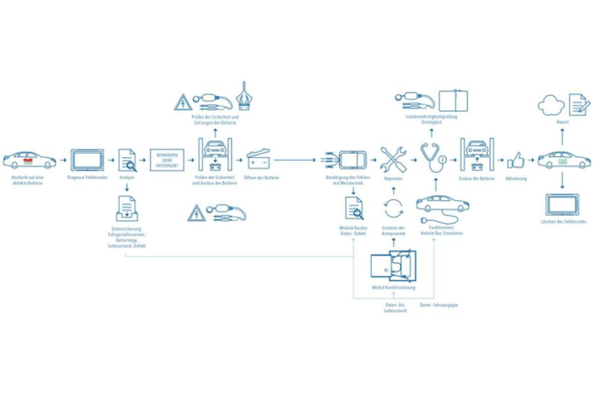 Die Grafik zeigt einen geführten Reparaturprozess entlang der gesamten Werkzeugkette. Dabei wird nicht nur die korrekte und sichere Diagnose und Überprüfung des Fahrzeugs gewährleistet, sondern der gesamte Vorgang dokumentiert. Jeder Arbeitsschritt kann in lokalen oder Cloudbasierten Systemen gesichert werden und steht dem Anwender zur Nachweispflicht zur Verfügung.