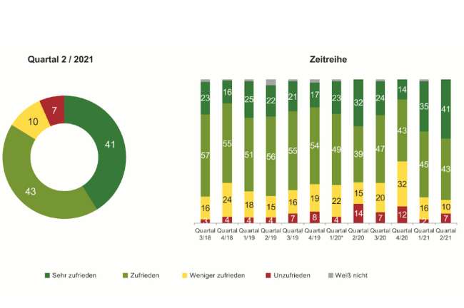 Die Zufriedenheit mit den Gebrauchtwagenverkäufen ist im 2. Quartal ebenfalls auf einen Rekordwert gestiegen. Insgesamt geben 84 Prozent der befragten Markenhändler an, mit den Abschlüssen sehr zufrieden (41 Prozent) bzw. zufrieden (43 Prozent) zu sein. Das ist der beste Wert seit dem Start des Händler-Trend-Barometers Österreich im dritten Quartal 2018. Die hohe Nachfrage sowie den Mangel an Gebrauchtwagen zeigt die Entwicklung der Standtage, die von niedrigen Werten nach Q4/20 und Q1/21 erneut deutlich gesunken ist und mit 58 Tagen den mit Abstand niedrigsten Wert seit Beginn der Befragung darstellt.