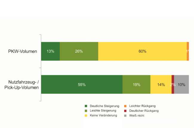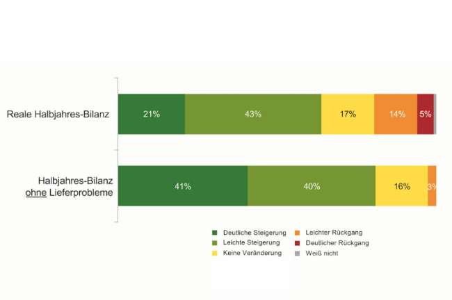 Die Engpässe in der Neuwagen-Lieferfähigkeit haben auch Auswirkungen auf die - grundsätzlich guten -Betriebsergebnisse der beim Händler-Trend-Barometer befragten Markenbetriebe. 41 Prozent (statt tatsächlich 21 Prozent) der befragten Betriebe hätten eine deutliche Steigerung realisieren können. 14 Prozent der Händler mussten einen leichten Rückgang hinnehmen, ohne Lieferprobleme wären es nur 3 Prozent gewesen. Tatsächlich haben 5 Prozent der interviewten Händler einen deutlichen Rückgang hinnehmen müssen, das wäre bei voller Lieferfähigkeit bei keinem der Unternehmer eingetreten.