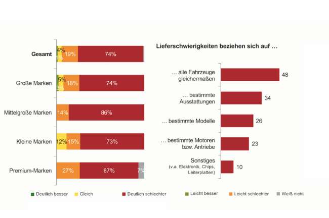Dramatische Verschlechterung der Lieferfähigkeit Die Neuwagen-Lieferfähigkeit hat sich in den vergangenen Monaten (im Vergleich zur Zeit vor der Corona-Pandemie) bei 93 Prozent der befragten Betriebe verschlechtert. Dabei geben 19 Prozent eine leichte, 74 Prozent eine deutliche Verschlechterung an. Bei Händlern mittelgroßer Marken gaben 100 Prozent eine Verschlechterung an (14 Prozent leicht, 86 Prozent deutlich).