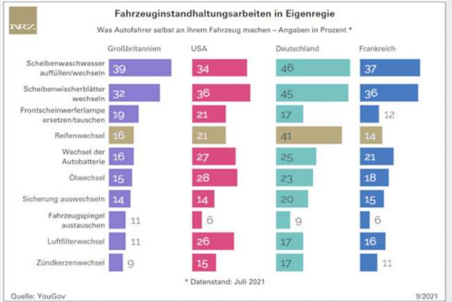 So gaben in Deutschland 46 % der Befragen an, Scheibenwasser auffüllen/wechseln, selbst zu erledigen. 45 % wechseln die Scheibenwischerblätter selbst und 41 % gaben an, den Reifenwechsel selbst durchzuführen.