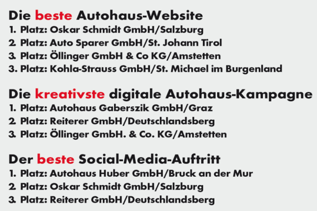 Den "Besten Social-Media-Auftritt" legte schon zum zweiten Mal die Autohaus Huber GmbH aus Bruck an der Mur hin: "Alle relevanten Social- Media-Kanäle werden hier sehr effizient bespielt", sagte Jury-Mitglied Mag. (FH) Michael Luipersbeck, Geschäftsführer der Autohaus Digital OG in Salzburg: "Dass ein Betrieb dieser Größe seine Energien auf 3 Kanäle verteilt, ist nicht selbstverständlich." Die Oskar Schmidt GmbH aus Salzburg und die BMWReiterer GmbH aus Deutschlandsberg folgten in diesem Bereich auf den Plätzen 2 und 3.