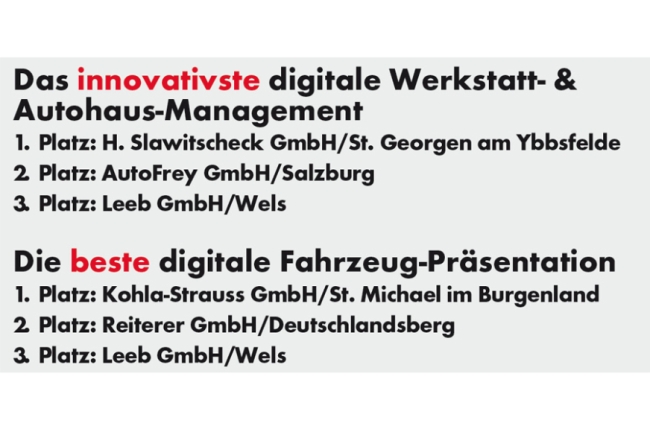 Die Slawitscheck AutohandelsgmbH bzw. die BMW H. Slawitscheck GmbH (St. Georgen am Ybbsfelde) holten sich heuer den Sieg in der Kategorie "Innovativstes digitales Autohaus-Management". Laut Heinz Strohbichler, Chef von S4 Computer, sorgt im Autohaus Slawitscheck eine fünfköpfige Task Force für eine konsequente Umsetzung der digitalen Strategie im gesamten Betrieb. "So wird nichts übersehen und bleibt nichts liegen." Das Autohaus Frey (Salzburg) sowie die Leeb GmbH aus Wels kamen auf die Ränge 2 und 3.