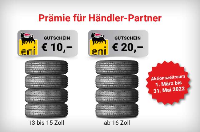 Neben der ausgezeichneten Gewinnspanne von LASSA Reifen belohnt Auto Plus seinen Händler-Partner mit bis zu € 20,- ENI Tankgutscheinen für jede Garnitur, die zum Vollkasko-Schutz angemeldet wird. Da kommt im Laufe einer Saison einiges an Zusatzboni zusammen.