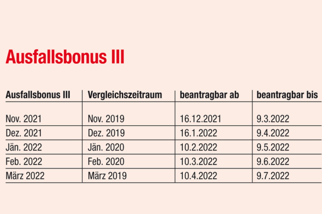 Voraussetzung für die Beantragung eines Ausfallsbonus für November und/oder Dezember 2021 ist ein Umsatzausfall von mindestens 30 Prozent im jeweiligen Betrachtungszeitraum (Kalendermonat) im Vergleich zum jeweiligen Vergleichsmonat 2019. Ab Jänner 2022 ist ein Umsatzrückgang von mindestens 40 Prozent erforderlich, wobei für Jänner und Februar 2022 jeweils die Monate des Jahres 2020 als maßgeblicher Vergleichszeitraum heranzuziehen sind. Der Ausfallsbonus III ist monatlich mit 80.000 Euro gedeckelt. Der Bezug von Kurzarbeitsbeihilfe kann den Ausfallsbonus aufgrund der Deckelung noch verringern. Die Höhe der Ersatzrate ist von der Branchenzugehörigkeit des Unternehmens abhängig und beträgt zwischen 10 Prozent und 40 Prozent.