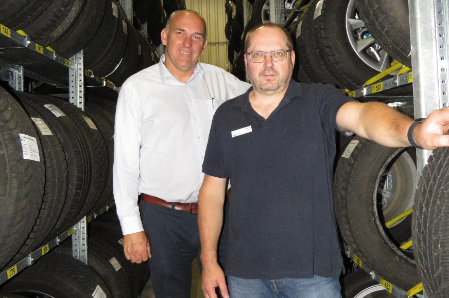 Es war eine einmalige Gelegenheit: Am alten Standort lagerte das Team von BMW Auer in Krems die rund 500 Reifengarnituren noch in Regalen. „Wir hatten immer zu wenig Platz“, sagt Standortleiter Günter Kalina. Dann kam 2017 die Übersiedlung an den neuen Standort und die Frage: „Was tun wir mit den Reifen?“ Kalina fuhr gemeinsam mit Walter Fichtinger, der im Autohaus den Bereich Teile und Zubehör leitet, zu verschiedenen Anbietern: „Doch die haben mit Stockwerken und Lift gearbeitet, außerdem war die Anordnung der Reifen nebeneinander mit vielen Gängen, sodass viel Leerplatz in den Hallen war.“ So habe man sich für das Konzept von Scholz Regalsysteme entschieden: „Ein Gang in der Mitte, links und rechts jeweils vier Reifen hintereinander“, sagt Fichtinger: „So bringen wir 840 Garnituren in der Halle unter.“