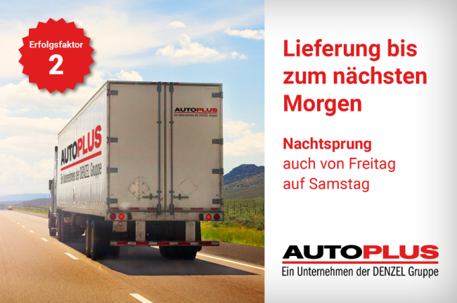 Eine weitere Spitzenleistung bringt AUTO PLUS im wahrsten Sinne des Wortes auf die Straße. Denn jede Bestellung bis 16 Uhr ist durch die Möglichkeit einer Belieferung im Nachtsprung österreichweit garantiert am nächsten Morgen (auch von Freitag auf Samstag) beim Handelspartner. Bestellungen bis 11 Uhr werden im Osten Österreichs sogar am selben Tag geliefert.
