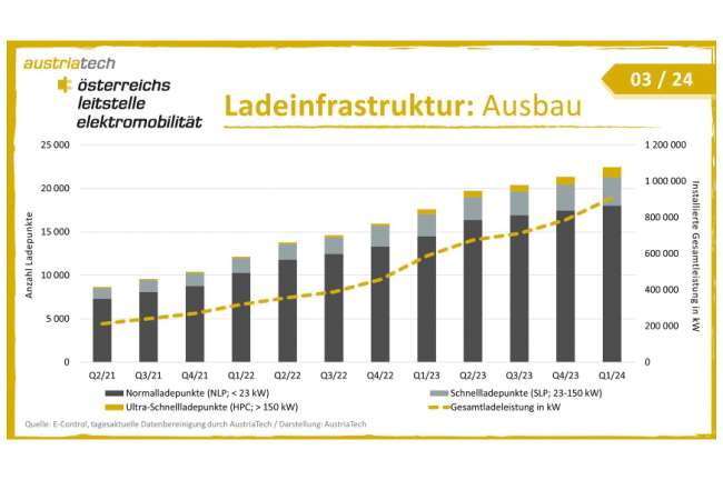 Wo den Strom hernehmen? Das ist wohl eines der beliebtesten Argumente, warum das mit der Elektromobilität sowieso und von vornherein nichts werden kann. Eine imposante Antwort geben aktuelle Zahlen zum Hochlauf der Ladeinfrastruktur in Österreich: „Mit dem Ende des 1. Quartals 2024 waren bereits über 900 Megawatt an öffentlich zugänglicher Ladeleistung verfügbar“, berichtet die OLÉ – Österreichs Leitstelle Elektromobilität (siehe Grafik). Beinahe 22.500 öffentlich zugängliche Ladepunkte versorgen die E-Mobilisten mit Fahrstrom. Es könne davon ausgegangen werden, dass sich der Trend zu HPC-Ladern mit einer Leistung von mehr als 150 kW weiter verstärken werde.