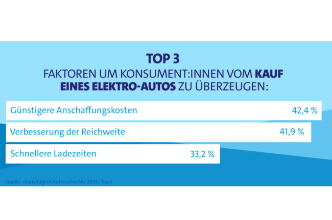 Besonders interessant ist die Antwort auf die Frage: „Welche Faktoren wären für Sie ausschlaggebend, um Sie doch vom Kauf eines Elektro-Autos zu überzeugen?“. Hier stechen drei Antworten besonders hervor:
