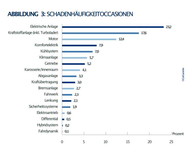 Dazu schreibt CarGarantie: "Die zunehmende Anfälligkeit elektrischer Systeme bestätigt damit die bereits in den Vorjahren prognostizierte Entwicklung. Mit wachsender Komplexität steigen sowohl die Reparaturintensität als auch die Wahrscheinlichkeit von Defekten."