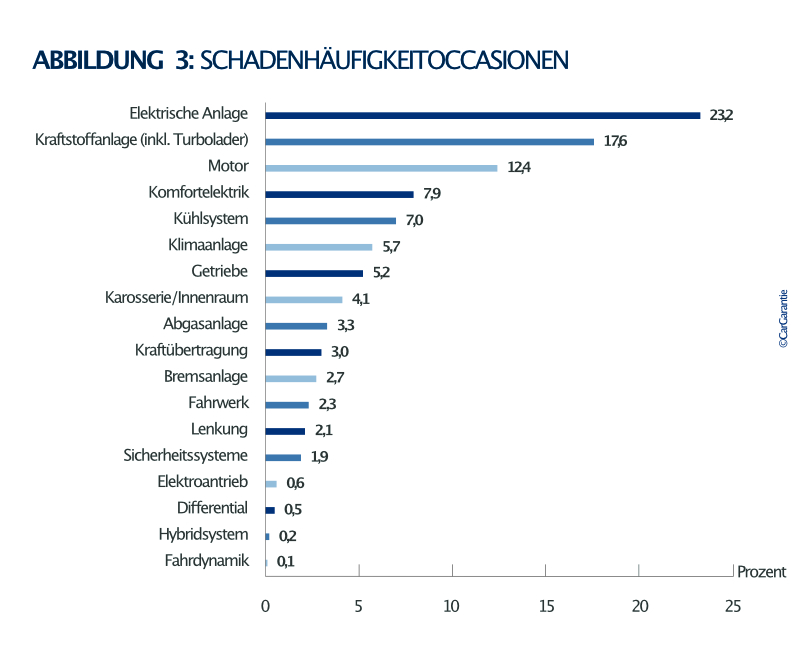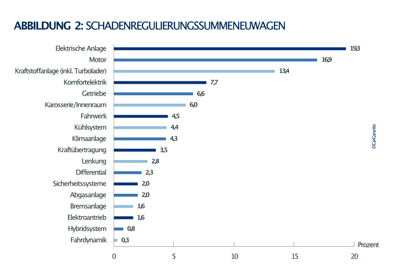 - Die Kraftstoffanlage inklusive Turbolader liegt mit 17,6 % Schadenhäufigkeit bei Gebrauchten auf Platz 2, bei Neuwagen mit 10,8 % auf Platz 3.