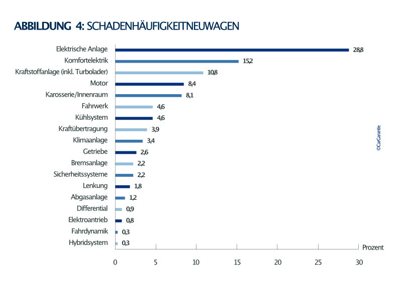 Während bei den Gebrauchtwagen der Motor die kostenintensivste Baugruppe bleibt (Anteil an der gesamten Schadenregulierungsssumme liegt bei 24,2 Prozent), hat bei den Neuwagen hier die elektrische Anlage die Spitzenposition eingenommen: 19,3 % der gesamten Schadenssumme entfallen auf diese Baugruppe, auf den Motor 16,9 %. Sowohl bei Neu- als auch Gebrauchtwagen ist die elektrische Anlage die defektanfälligste Baugruppe: Bei Gebrauchten liegt die Schadenhäufigkeit bei 23,2 %, bei Neuwagen bei 28,8 Prozent.