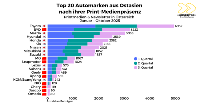 BYD (3.223 Artikel). Auf Platz 3 schaffte es Mazda mit 3.035 gedruckten Beiträgen. Mit Ausnahme von Mazda, Nissan und Subaru sank die Medienpräsenz bei allen anderen Mitbewerbern aus Japan und den drei Konkurrenten aus Südkorea (Hyundai, Kia und KGM) im 3. Jahresviertel.