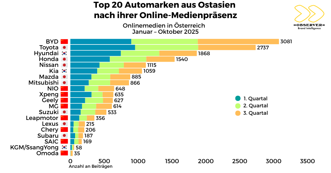 In Onlinemedien (inkl. Newslettern, Foren und Blogs) geht BYD klar als Sieger hervor. Zwischen 1. Januar und 30. September 2025 wurden dazu 3.081 Beiträge veröffentlicht, die im Zusammenhang mit dem Thema Auto, Unternehmen bzw. Automarke erschienen sind. BYD verzeichnete einen deutlichen Sprung von 900 Artikeln im 1. Quartal auf 1.200 Artikel im 3. Quartal.