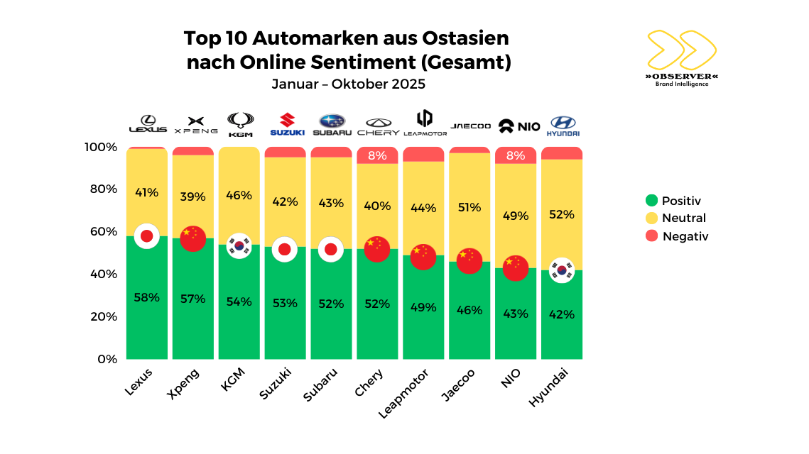 Fünf Automarken aus China, drei aus Japan und zwei aus Südkorea landeten unter den Top 10 mit der positivsten Berichterstattung im Netz. An der Spitze des Rankings lag Lexus (58 Prozent positive Beiträge) knapp vor Xpeng (57 Prozent). Mit 14 Prozent verzeichnete BYD das negativste -Online-Sentiment.