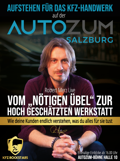 "Vom ‚notwendigen Übel‘ zur hoch geschätzten Werkstatt - Wie Deine Kunden endlich verstehen, was Du alles für sie tust“, lautet der Vortrag von Robert Merz, Gründer und strategischer Kopf der Kfz-Rockstars.