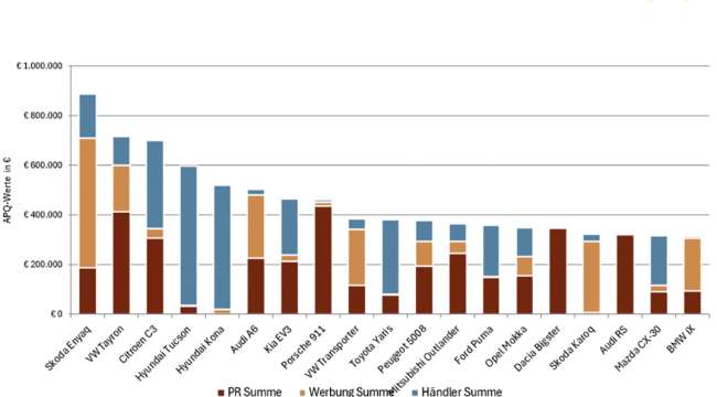 Der Škoda Enyaq kam diesmal bei der Markenwerbung auf den ersten Platz. Das Elektro-Modell erzielte ein Anzeigenpreisäquivalent von 520.103,80 Euro. Von Platz 3 auf Platz 2 rückte der Audi A6 vor, dicht gefolgt vom VW Transporter.