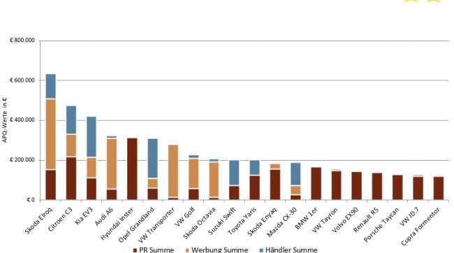 Bei den Händleranzeigen sicherte sich der KIA EV3 den ersten Platz, ihm auf den Fersen war der Opel Grandland. Bei den PR-Inseraten punktete diesmal der Hyundai Inster (APQ-Wert: 312.655 Euro), gefolgt vom Citroën C3 (APQ-Wert: 217.301 Euro) und vom BMW 1er (APQ-Wert: 165.801 Euro).
