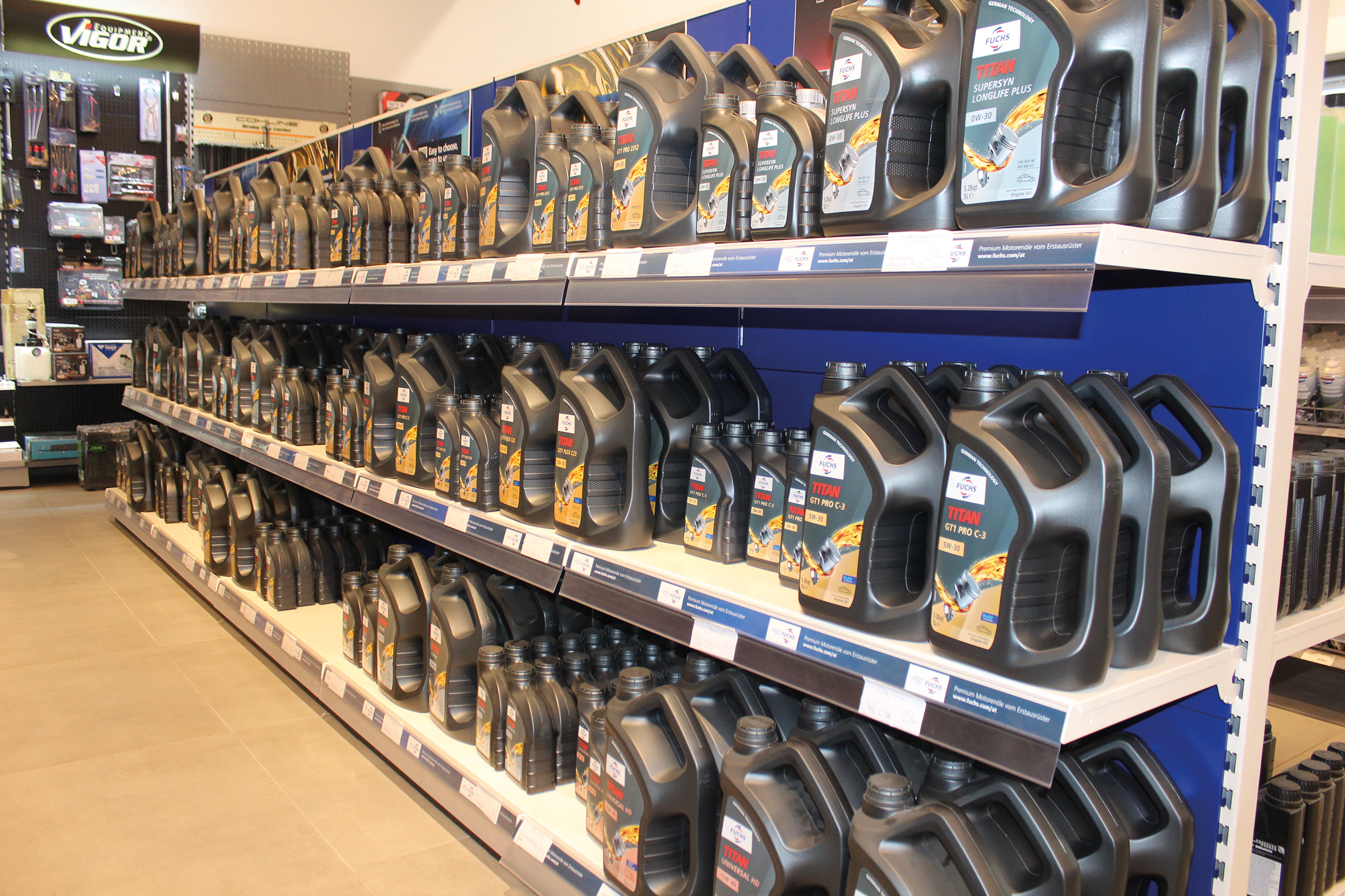 Das oben erwähnte Alleinstellungsmerkmal hat Brand schon 2017 mit Fuchs Schmierstoffe zusammengeführt. „Wir wollten Qualität und wir wollten Produkte, die es nicht überall gibt“, erklärt Brand-Geschäftsführer Werner Seyfried. Dabei ist der hohe Qualitätsanspruch mit echten Hersteller-Freigaben ein entscheidender Punkt. „Es gibt sehr große Unterschiede in der Öl-Qualität und in der richtigen Verwendung. Viele Kunden und viele Werkstätten wissen das nicht. Wir klären auf und bieten das passende Produkt“, so Brand. Entsprechend umfassend sind das vorhanden Lager und die Auswahl an Fuchs Schmierstoffen.