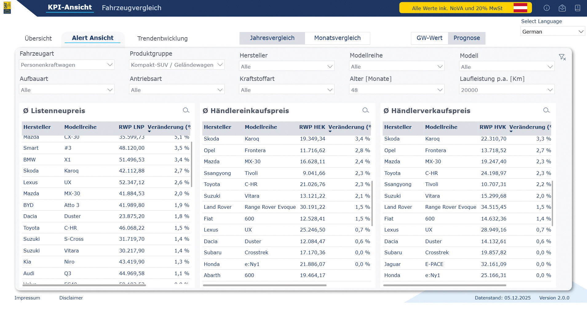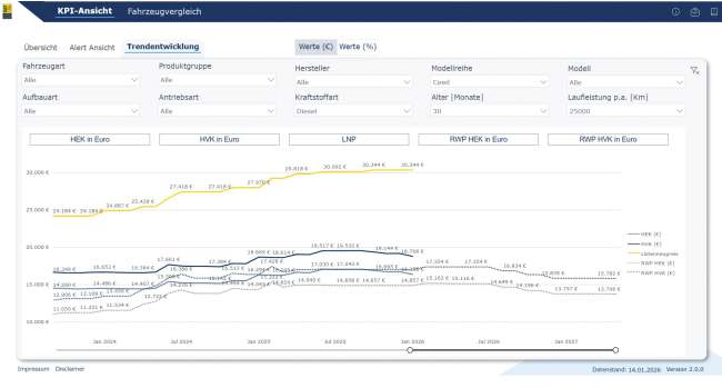 Neu im DAT-Portfolio ist das Technologie-Dashboard Vehicle Value Tracker, ein Tool zur Analyse von Restwertentwicklungen diverser Fahrzeugmodelle verschiedener Hersteller. Konkret können damit KPI-Ansicht (Listenneupreis, Händlereinkaufspreis, Händlerverkaufspreis), Alert-Ansicht (Erkennung von Ausreißern hinsichtlich der Restwertentwicklung), Trendentwicklung (Analyse der Restwertentwicklung sowie Prognosen in grafischer Form) sowie Fahrzeugvergleich (Vergleich der Restwertperformance mehrerer Fahrzeuge) abgebildet werden. Dem Anwender wird darüber hinaus die Möglichkeit eingeräumt, unterschiedliche Modelle und deren Restwertentwicklung im Zeitverlauf zu analysieren. Alle Daten basieren auf den Applikationen der DAT, die dem Markt zur Verfügung stehen. Innerhalb des Vehicle Value Trackers werden ausschließlich Restwertprognosen von Fahrzeugen abgebildet, die nicht älter als sechs Jahre sind. Die neue DAT-Lösung wird im ersten Halbjahr 2026 dem Markt zur Verfügung stehen.