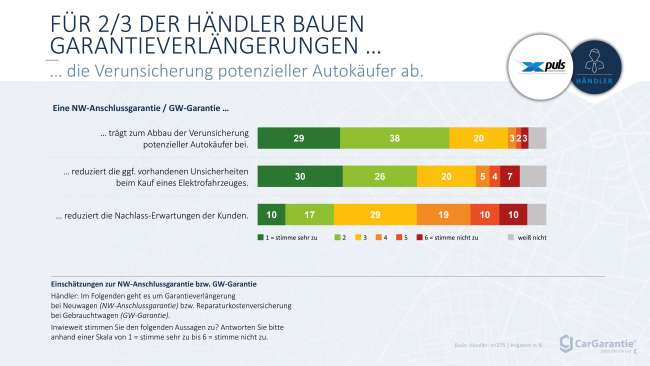 Dr. Marcus Söldner, Vorstandsvorsitzender der CarGarantie, dazu: „Unsere Garantieprodukte und Reparaturkostenversicherungen sind ein gutes Mittel, um der Kaufzurückhaltung entgegenzuwirken – und sie rechnen sich für den Händler. Sie erleichtern den Fahrzeugverkauf, binden den Käufer stärker an das Autohaus und die Werkstatt und schützen den Kunden vor Folgekosten. Das erleichtert die Kaufentscheidung und verbessert Umsatz und Ertrag im Unternehmen.“ Studienleiter Konrad Weßner ergänzt: „Zudem reduzieren Garantien die Unsicherheit bei der Anschaffung von Elektroautos, wie 56 Prozent der Händler bestätigen, und auch die Nachlasserwartungen der Kunden.“