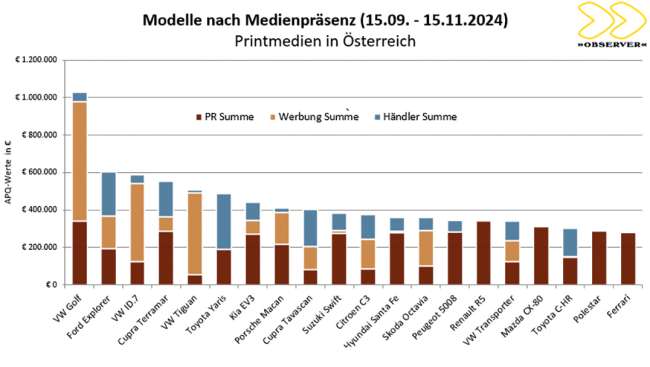 Beobachtet wurde diesmal der Zeitraum zwischen 15. September und 15. November 2024: Volkswagen war bei der Markenwerbung mit einem Anzeigenpreisäquivalent von 2.171.794 Euro eindeutig der Spitzenreiter. Der APQ-Wert von VW betrug ein Vierfaches vom Zweitplatzierten Škoda (507.008 Euro) bzw. ein Fünffaches vom Drittplatzierten Mercedes (414.275 Euro).