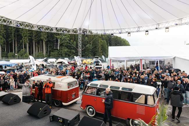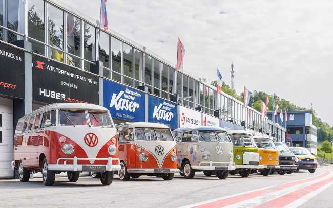 Ein Highlight im abwechslungsreichen Rahmenprogramm waren die Testfahrten am Salzburgring mit Museumsstücken aller Bulli-Generationen: Eine seltene Gelegenheit, die sich viele Bulli-Fans nicht entgehen ließen.