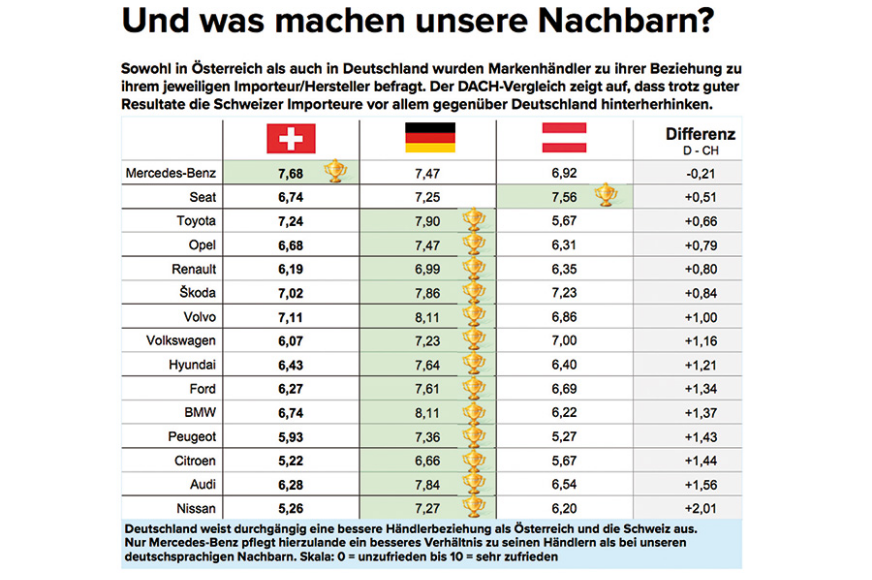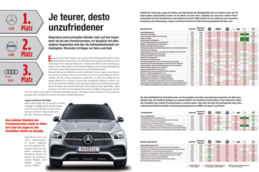 Im Bereich Aftersales geht es um so elementare Dinge wie Vorgabezeiten für Wartungs- und Reparaturarbeiten oder Teilepreise. Bewertet wird auch der persönliche Kontakt zu den Verantwortlichen des Importeurs. Je zufriedener ein Händler ist, desto höher ist die Note (10 =sehr zufrieden, 0 =unzufrieden). Wenn bei Ihnen also das Telefon läutet: Nützen Sie die Chance! (MUE)