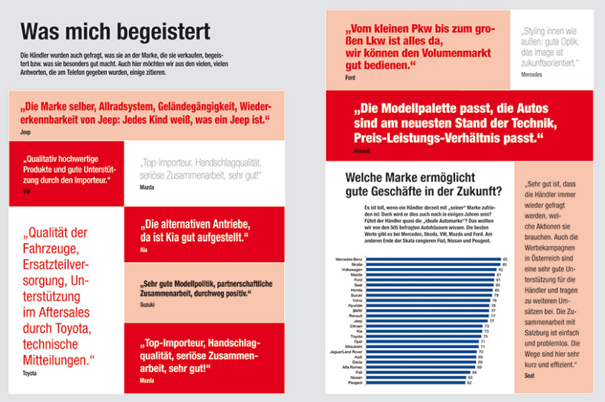 Die Interviews dauern jeweils rund eine Viertelstunde (wobei es, wenn sich der Händler den Frust von der Seele reden oder er den Importeur ausdrücklich loben will) auch länger sein kann. Es geht um das Margen- und Bonussystem für Neuwagen ebenso wie um die Liefertreue des Importeurs oder die Unterstützung des Gebrauchtwagenverkaufs.