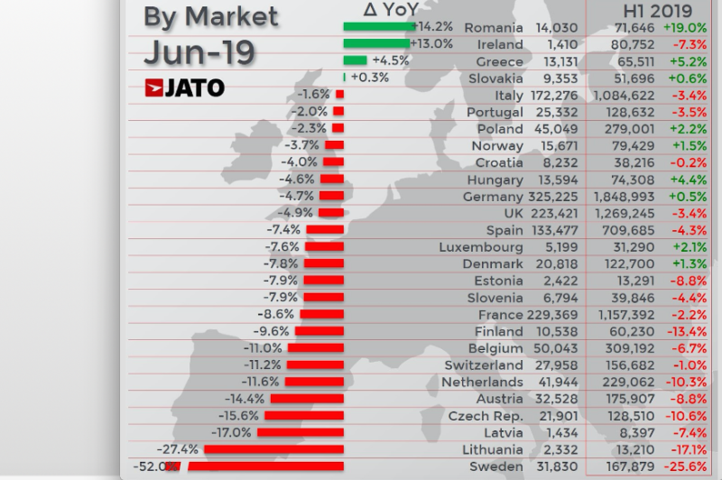 Keine guten Signale enthalten die von Jato Dynamics für das 1. Halbjahr 2019 veröffentlichten Daten.