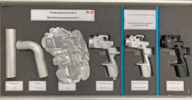 Scholz, Vertriebsleiter für Deutschland und Österreich, ausdrückt, werden mit insgesamt rund 300 Mitarbeitern etwa 140.000 Lackierpistolen pro Jahr gefertigt. Theoretisch könnten täglich bis zu 1.000 Einheiten – quer durch alle Modelle – hergestellt werden. Ein Drittel der Jahresproduktion wird übrigens in Deutschland und Österreich verkauft. „In beiden Ländern sind die Handwerker sehr loyal. Wenn sie sich beim Werkzeug auf eine Marke fest-gelegt haben, bleiben sie bei dieser“, so Scholz.