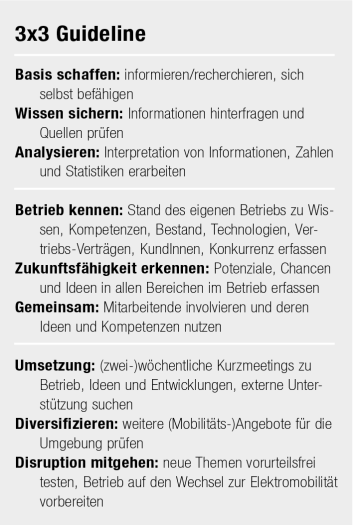 Es braucht vor allem Kreativität und Entscheidungskraft. Der Lieblingshändler ist mittlerweile nur noch Servicepartner und konnte sich etwas Freiheit verschaffen. Der Junior, designierter Nachfolger und Petrolhead, informiert sich mittlerweile über Lehrgänge in Hochvolt-Technologien für Elektroautos. Selbst die Idee, chinesische Elektroautos zu verkaufen, wird diskutiert und der Kauf eines Elektroautos als täglich genutztes Fahrzeug für den Betrieb ist geplant, um sich sowie die Belegschaft an das Thema heranzuführen. Mittlerweile bringen alle Mitarbeitenden immer wieder Ideen ein, wie der Betrieb in die Zukunft geführt werden kann – dieses Engagement braucht es heute und ist eine gute Basis für den Wandel, in dem es um Wissensaufbau und starke strategische Entscheidungen geht.